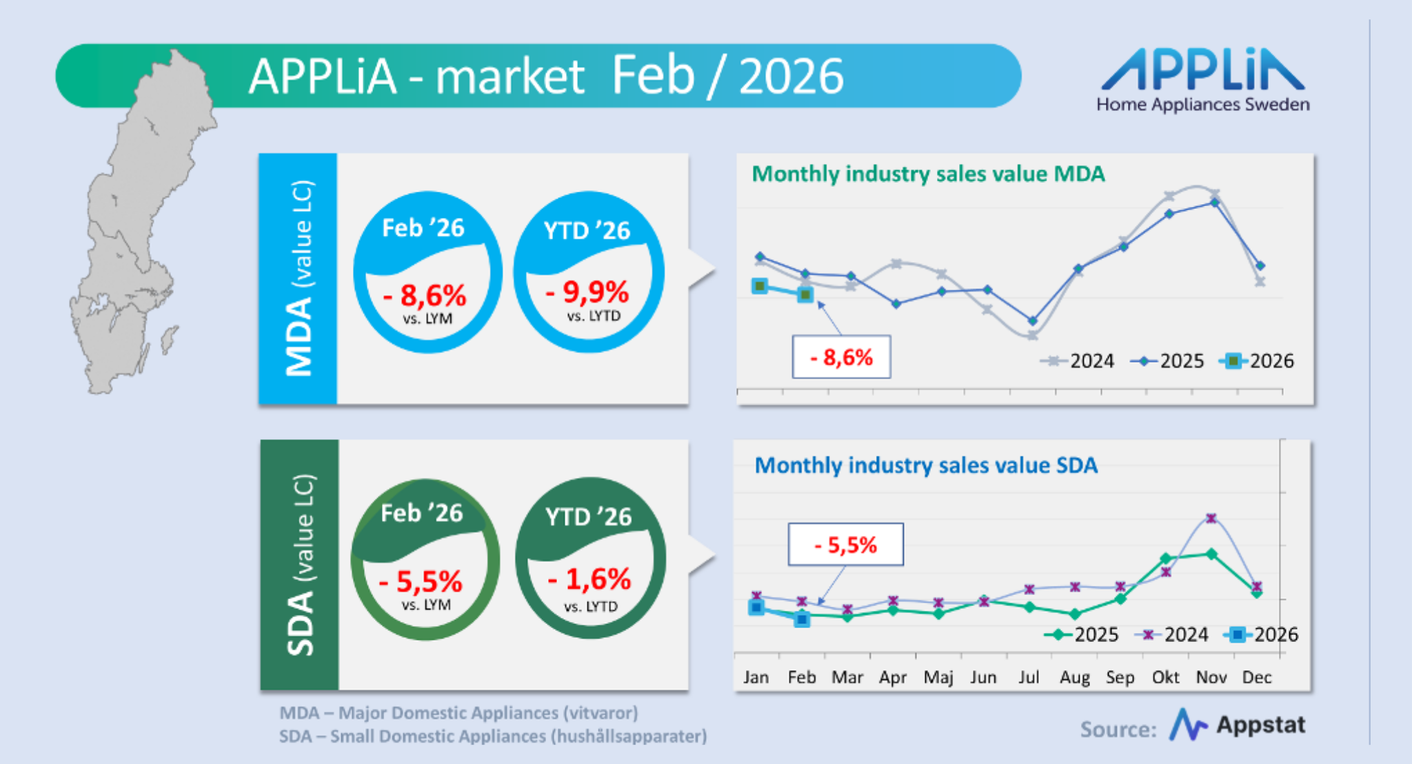 Appstat har nu presenterat marknadssiffrorna för februari och visar på att tappet fortsätter för marknaden under februari. Tappet mot föregående år uppgår nu till nästan 8 procent värdemässigt (sell-in värde) för den svenska vitvaru- och hushållsapparatmarknaden.