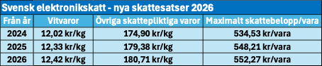 Skatteverket har nu meddelat de nya skattesatserna från och med den 1 januari 2026 för den svenska elektronikskatten (LSKE) gällande vitvaror och hemelektronik. Den indexuppräkning som sker vid detta datum följer normalt index från juli till juli. 2026-års uppräkning verkar dock ha skett på en något lägre nivå än tidigare och landar på en ökning på 0,7 procent.