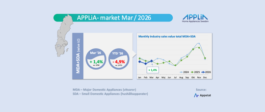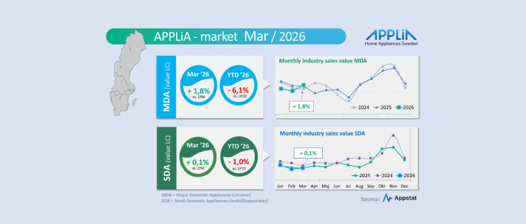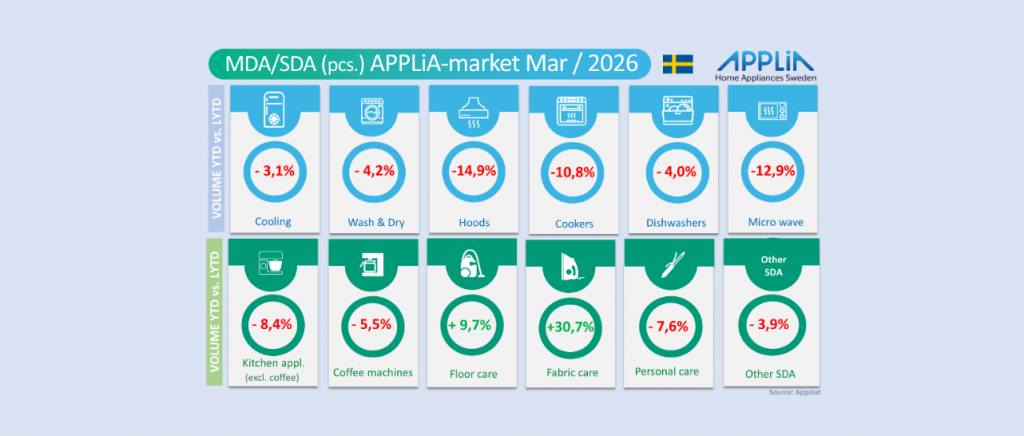Både vitvaror (MDA) och de mindre hushållsapparaterna (SDA) hade en något positiv enskild månad jämfört med mars 2025. Värdemässigt med plus 1,8 respektive plus 0,1 procent. Kvartalsresultaten ”Year-to-date” är dock fortfarande lysande ”röda”. Dock, speciellt positivt i månaden inom MDA, visade sig både ”cooling” och ”dishwasher” med glädjande positiv utveckling. Inom segmentet SDA utmärkte sig både kaffemaskiner och större köksmaskiner/assistenter positivt under mars. Men allra bäst månad hade ”fabric care”, som innehåller all strykutrustning för hushållsbruk, där månadsjämförelsen gav ett rejält plus i jämförelse med mars 2025.
