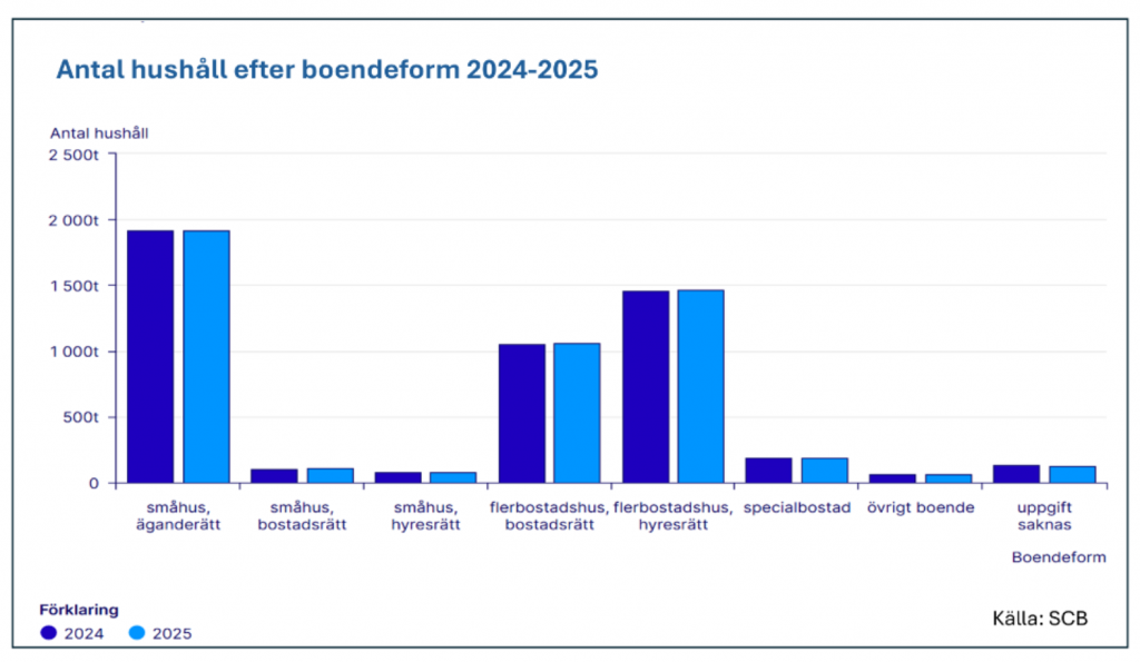 SCB’s årliga redovisning av antalet hushåll i Sverige visar på en ökning. Vid slutet av år 2025 uppgick antalet hushåll i Sverige till drygt fem miljoner, totalt 5 002 600. Det innebär en ökning med cirka 30 600 hushåll jämfört med året innan, vilket motsvarar knappt en procents tillväxt. Den mest förekommande boendeformen var småhus med äganderätt, där 38 procent av hushållen bodde. Därefter följde hyresrätter i flerbostadshus som stod för 29 procent, medan 21 procent bodde i bostadsrätter. Den genomsnittliga bostadsytan i landet till 42 kvadratmeter per person.