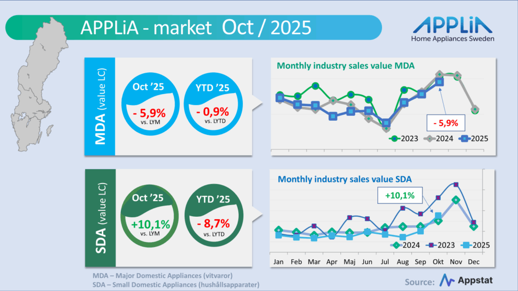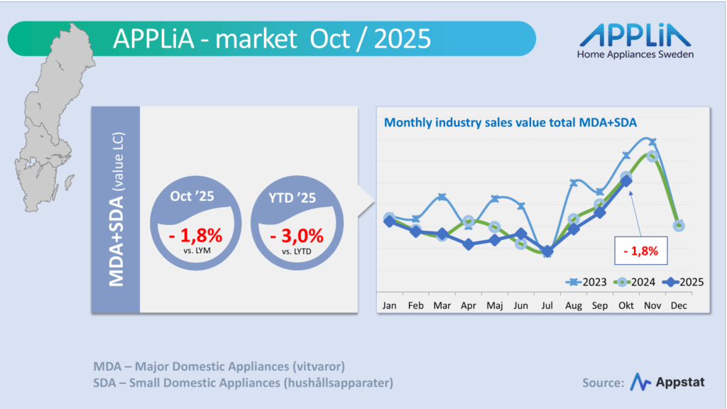 Sammanräknat SDA (hushållsapparater) och MDA (vitvaror) så fattas en del värde gentemot föregående år – nu minus 3 procent efter tio månader. Jämfört med 2023 så ser de första tio månaderna dock mycket sämre ut. Då är marknadsvärdet hela 13 procent lägre i jämförelse. Så nu börjar det kännas vara hög tid att välkomna en återhämtning inför 2026.