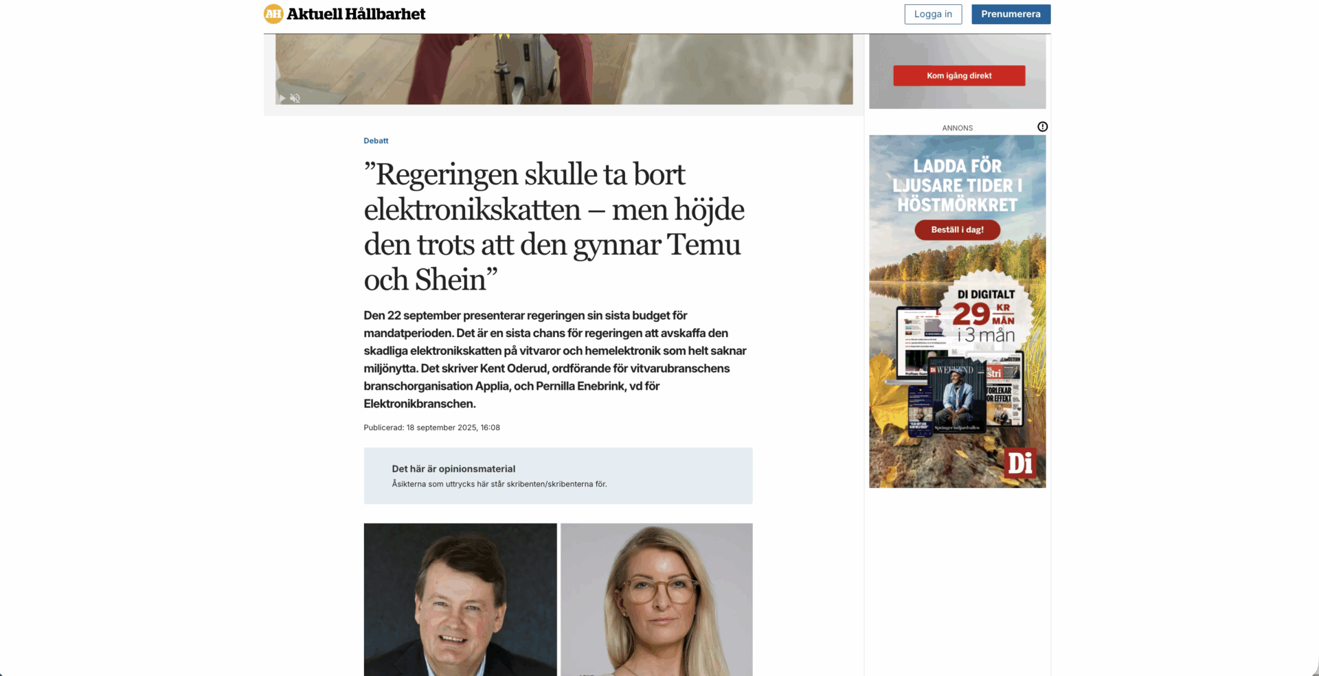 APPLiA och Elektronikbranschen i Aktuell Hållbarhet: Den 22 september presenterar regeringen sin sista budget för mandatperioden. Det är en sista chans för regeringen att avskaffa den skadliga elektronikskatten på vitvaror och hemelektronik som helt saknar miljönytta. Det skriver Kent Oderud, ordförande för vitvarubranschens branschorganisation Applia, och Pernilla Enebrink, vd för Elektronikbranschen.
