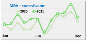 hushållsapparaterna (SDA – Small Domestic Appliances) är detta speciellt tydligt, men även MDA – de större vitvarorna – har en förhöjd historisk försäljning under det andra halvåret. Alla graferna visar marknadsförsäljningen per månad över åren 2020 och 2021.