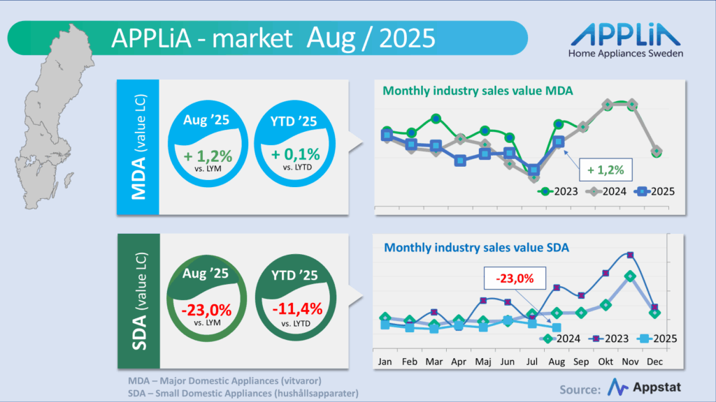 Samlat för de båda segmenten MDA+SDA släpar då APPLiA-marknaden värdemässigt med drygt 3 procent gentemot fjolåret. De positiva signaler som omger MDA räcker ännu inte till för att lyfta den gemensamma marknaden upp till fjolårsnivå.